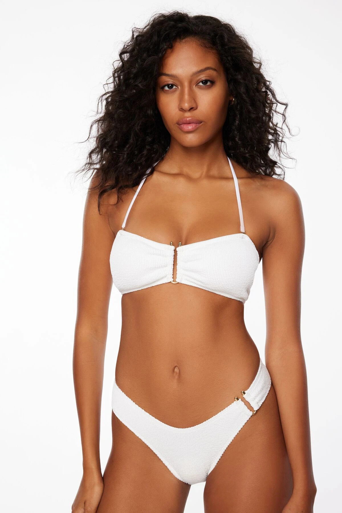 This is a textured cheeky bikini bottom with a ring gold hardware detail.