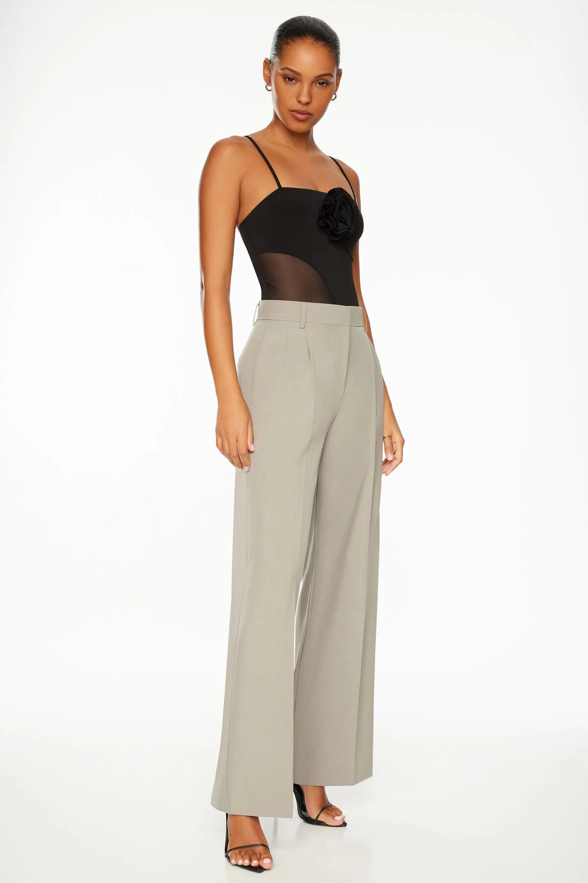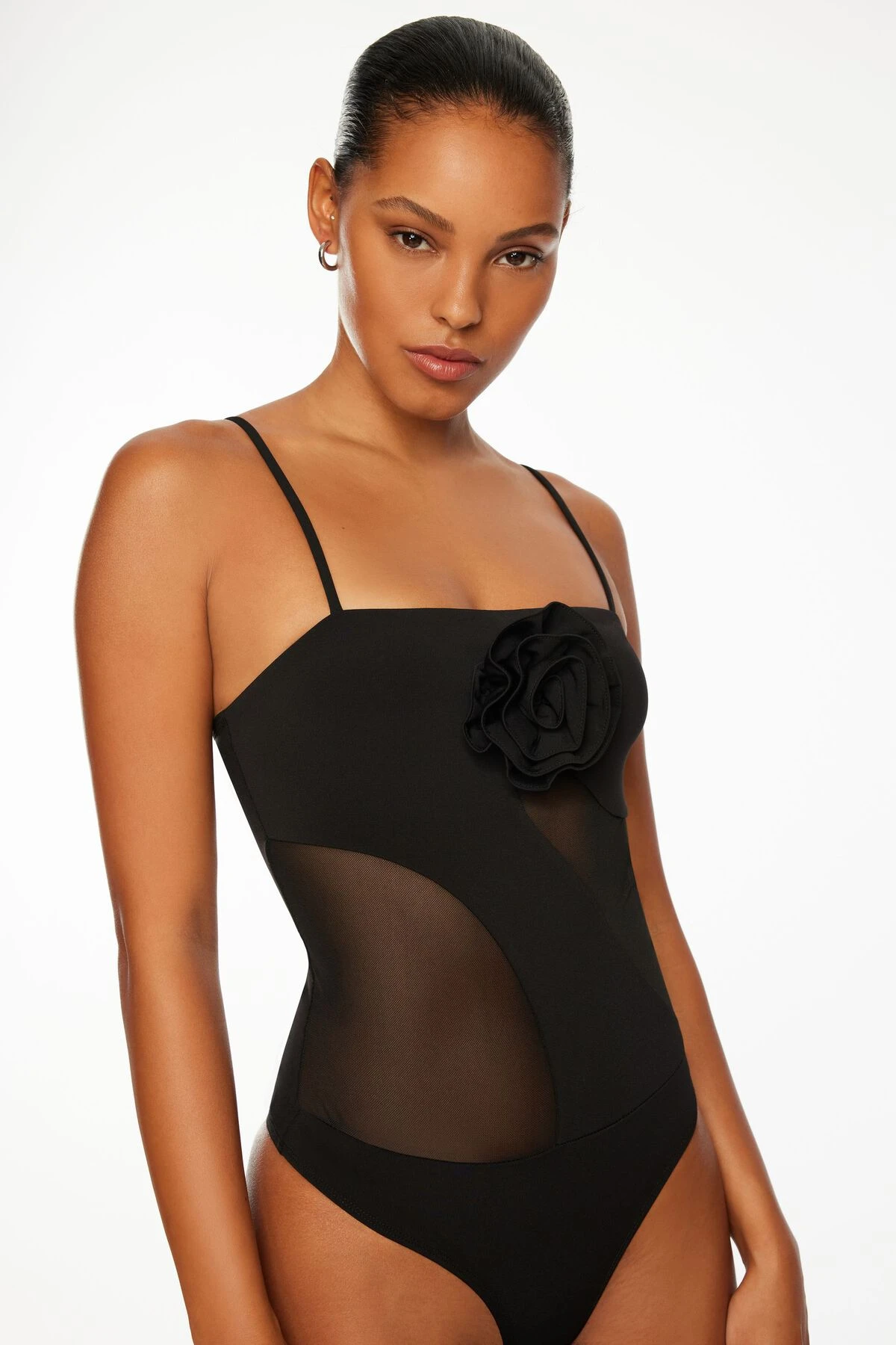 This is a mesh bodysuit with a rosette flower detail – Designed with a stretch contour fabric.