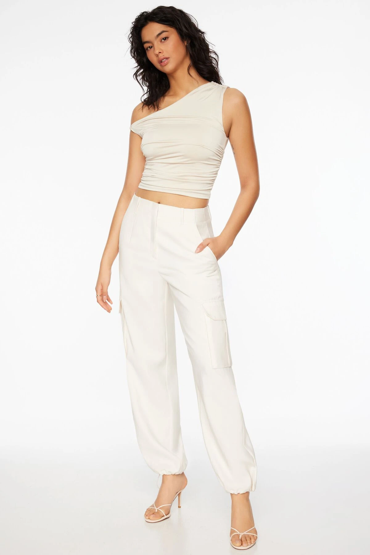 This is a ruched one-shoulder tank top. Its made with a lined effortlessly flattering fabric – designed to shape your body.