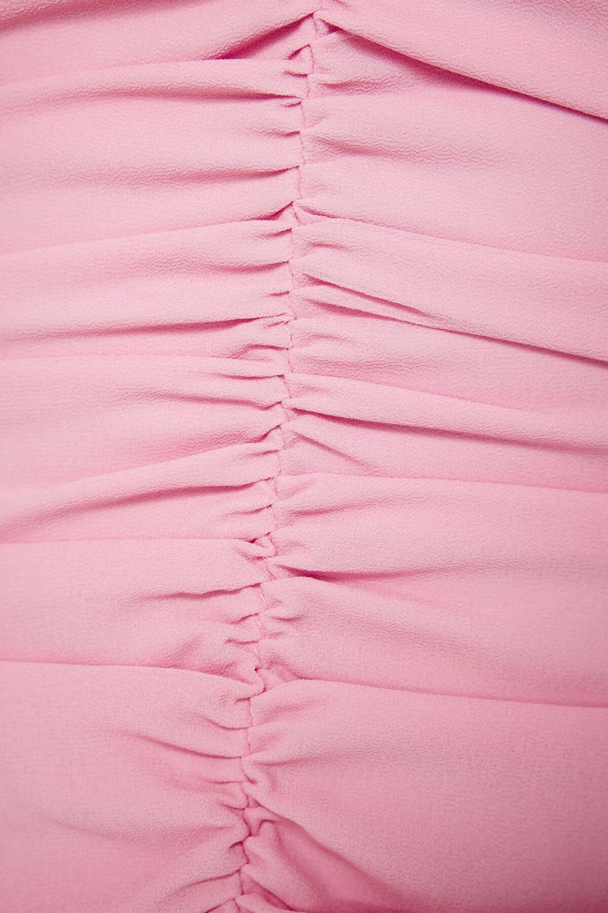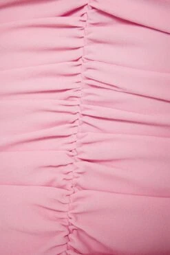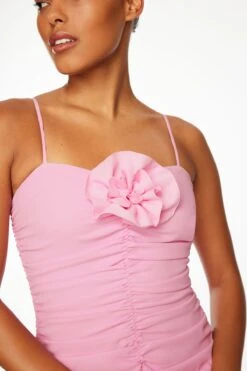 This is a mini dress – Designed with a lightweight ruched fabric and a flower detail applique.