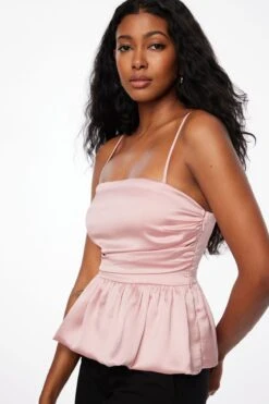 Indulge in this ruched peplum satin top – Designed to be fitted and detachable adjustable shoulder straps for alternate styling.