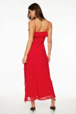 This is a ruffled chiffon midi dress – Designed with a ruffled trim and fitted to your form.