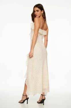This is a ruffled chiffon midi dress – Designed with a ruffled trim and fitted to your form.