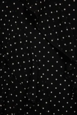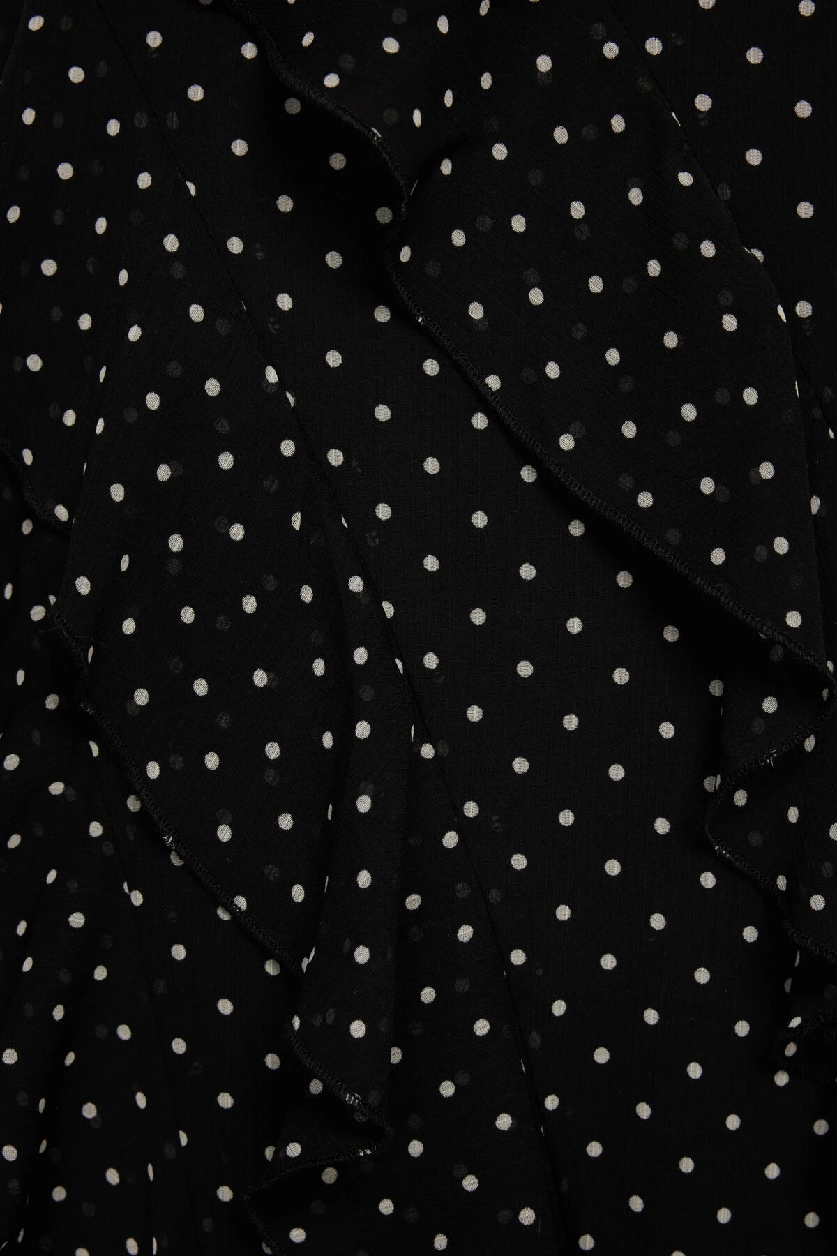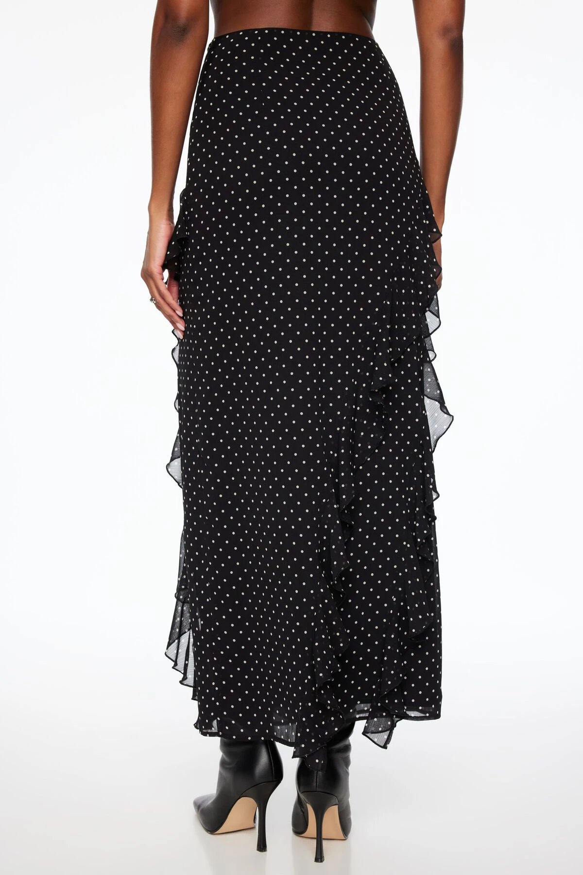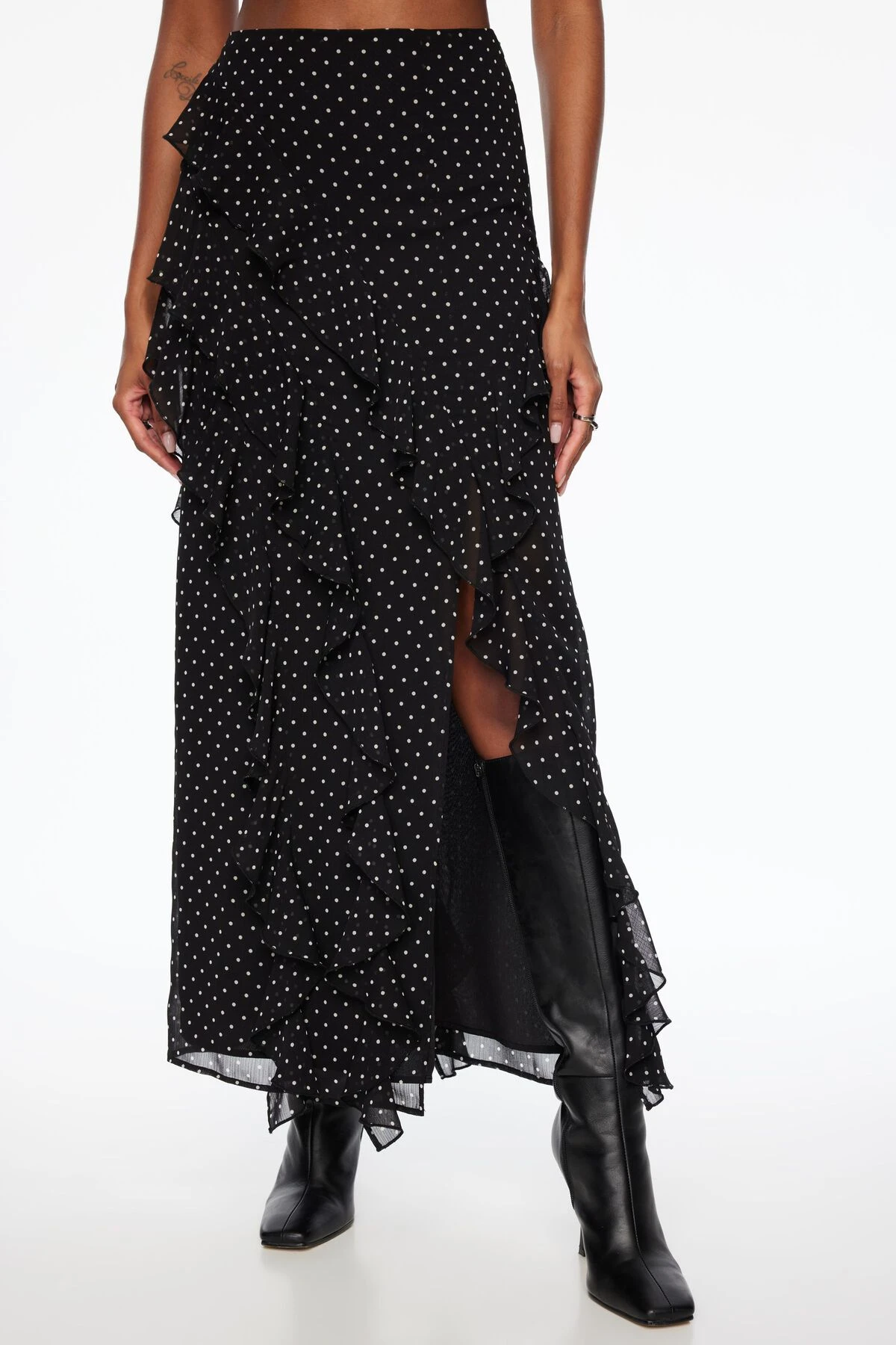 This is a ruffled crepe maxi skirt – Designed with a polka dot pattern.