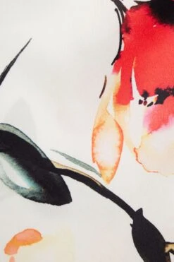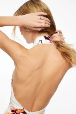 This is a halter neckline romper made with a lustrous satin fabric and a floral print.