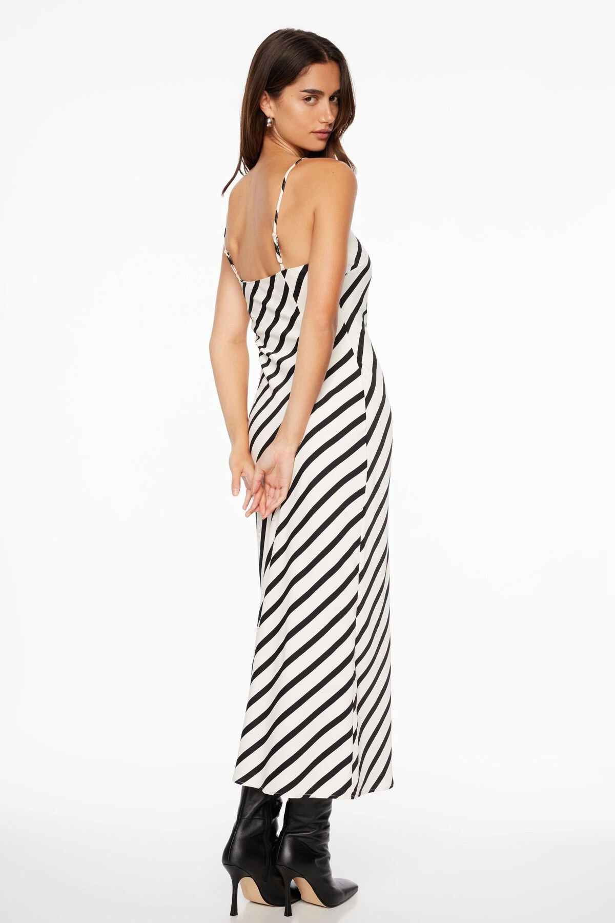 This is a scoop neck slip dress, designed with a stripe pattern throughout.