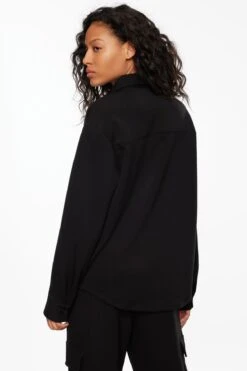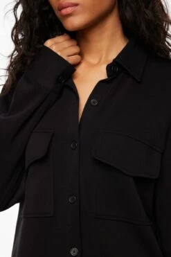A soft-feel button-up shirt with large pockets. Made with lightweight scuba fabric, that’s cool to the touch, sleek, and wrinkle resistant.