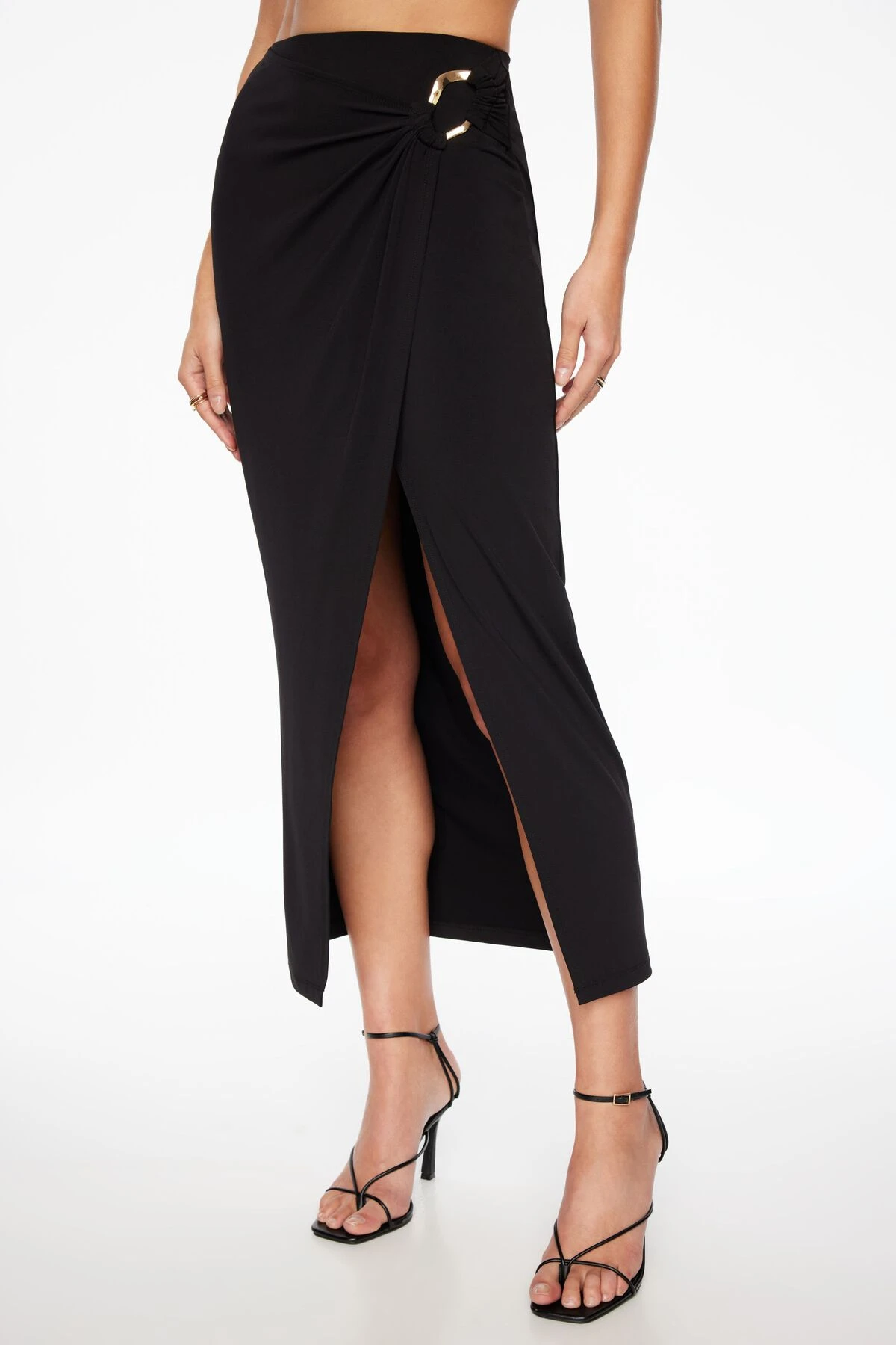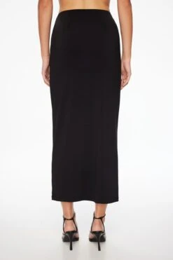 This is a wrap jersey maxi skirt – Designed to be fitted to your form with a slight stretch and sculptural hardware at the waist.
