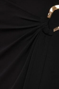 - Sculptural hardware and gathering at waist