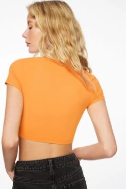 This is a short sleeve knotted crop top – made with an ultra soft stretch fabric.