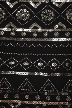 This is a sequin and bead embellished chiffon skirt. Designed with a graphic pattern throughout.
