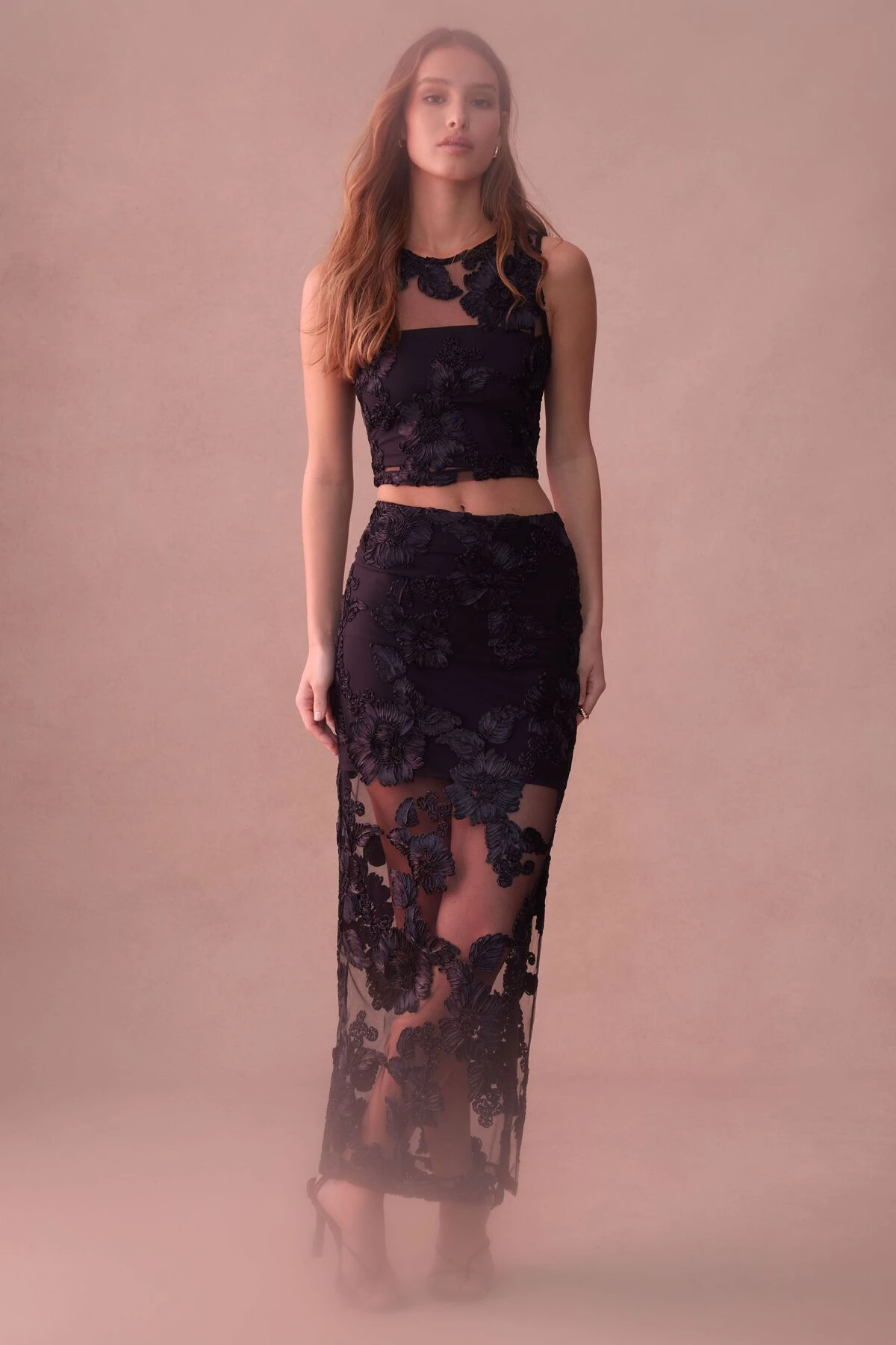 This is a a sheer tulle maxi skirt – Designed with floral appliqués throughout.