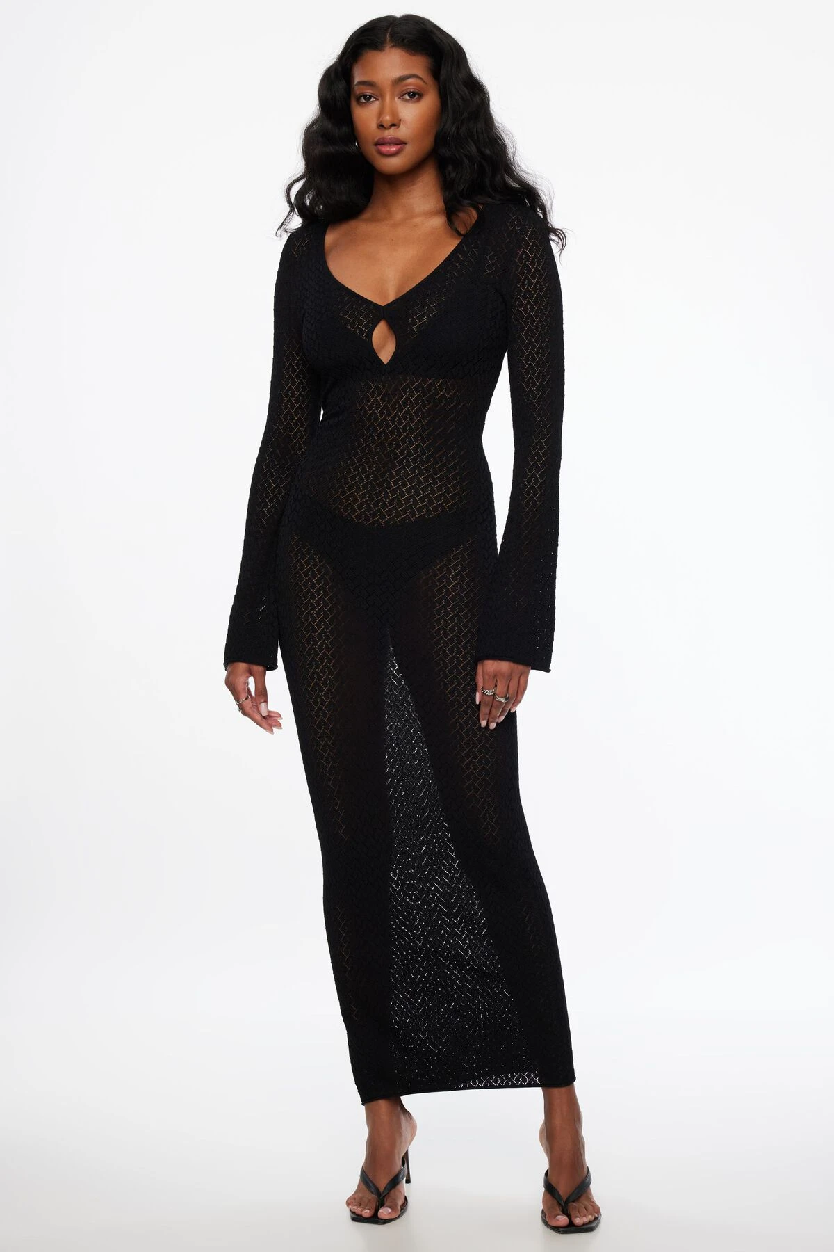 Dynamite Sheer Keyhole Pointelle Maxi Dress In Jet Black