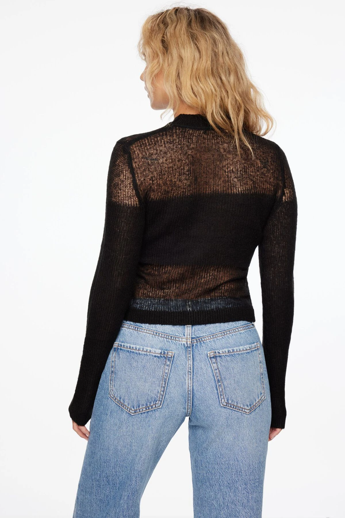 Add a touch of skin with this sheer crewneck sweater.