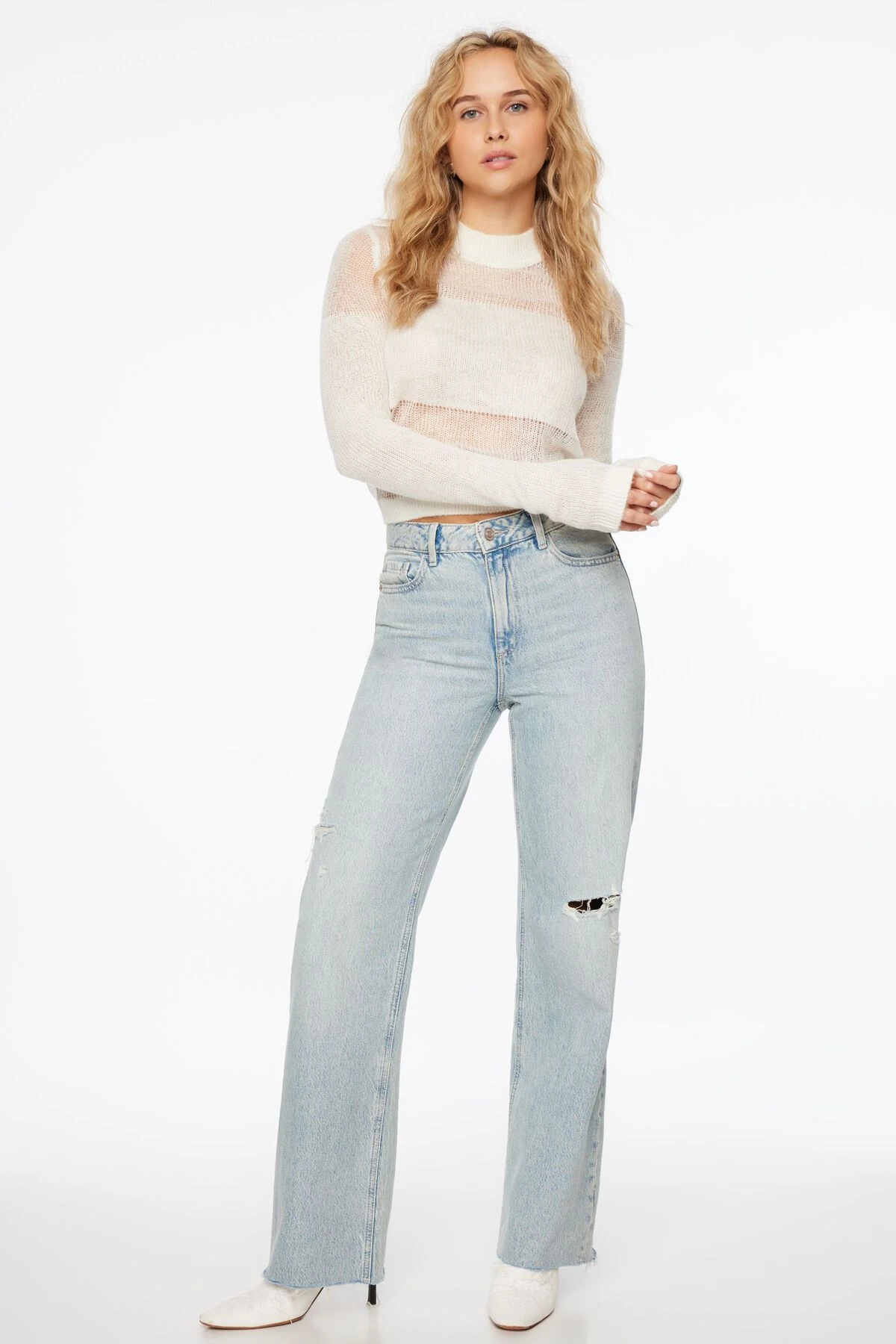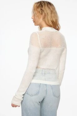 Add a touch of skin with this sheer crewneck sweater.