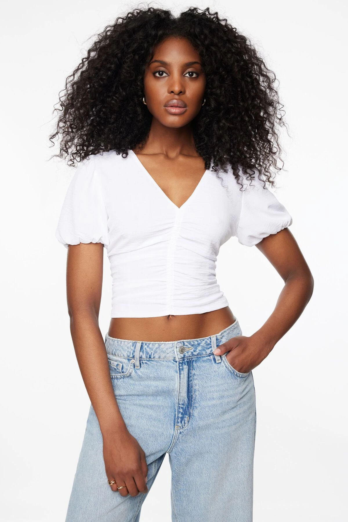 This is a v-neckline top with puff sleeves and a ruched detail.