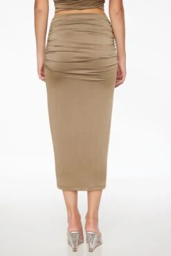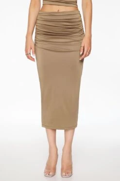 This is a sculpting midi skirt with a side slit. Made with soft and stretchy fabrics.