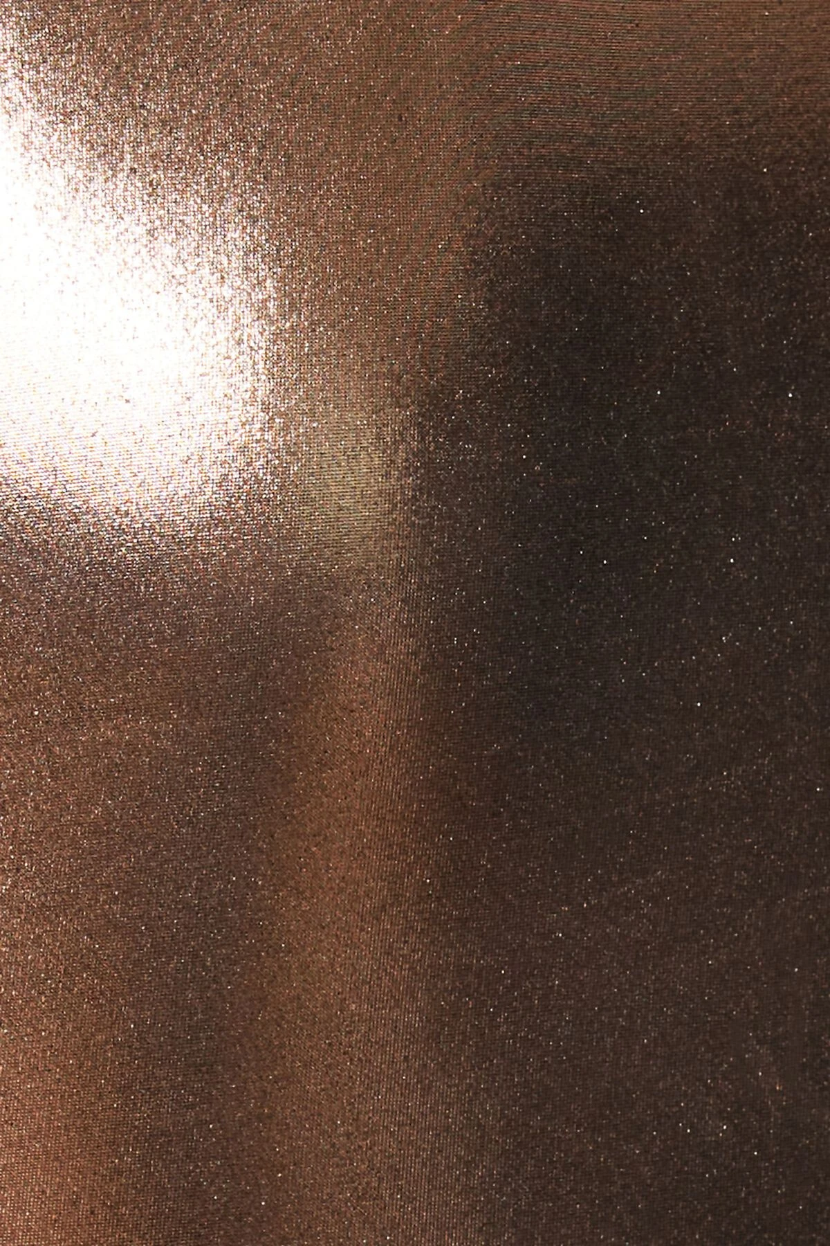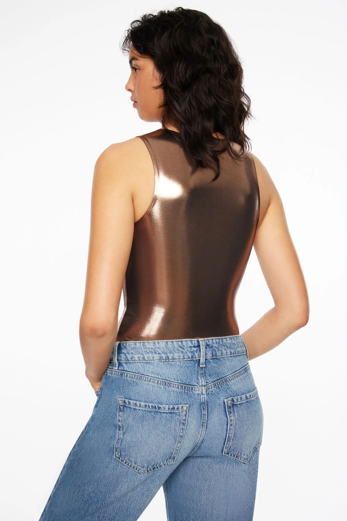 This is a metallic rose gold bodysuit. Made with figure skimming fabrics made to sculpt your form.