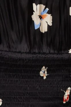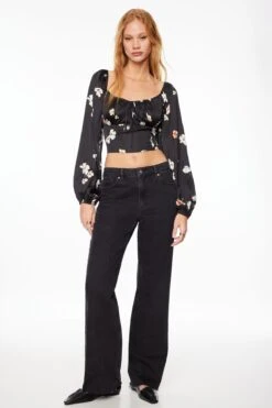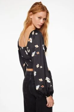 This is a Square neck cropped blouse with bubble sleeves and a floral print.