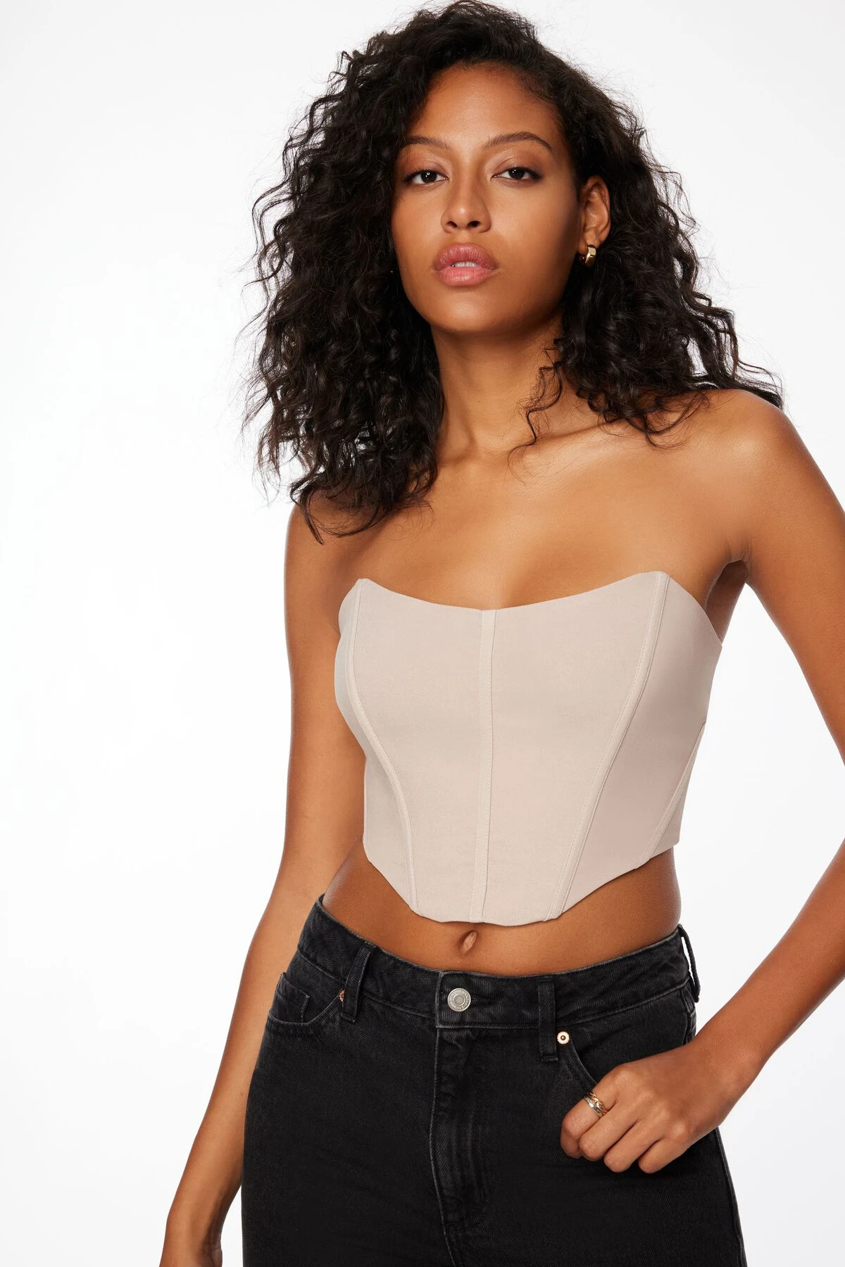 This is a strapless corset crop top with a boning detail.