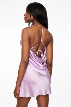 This is a v-neckline open-back mini dress made with soft satin fabric and a lustrous touch.