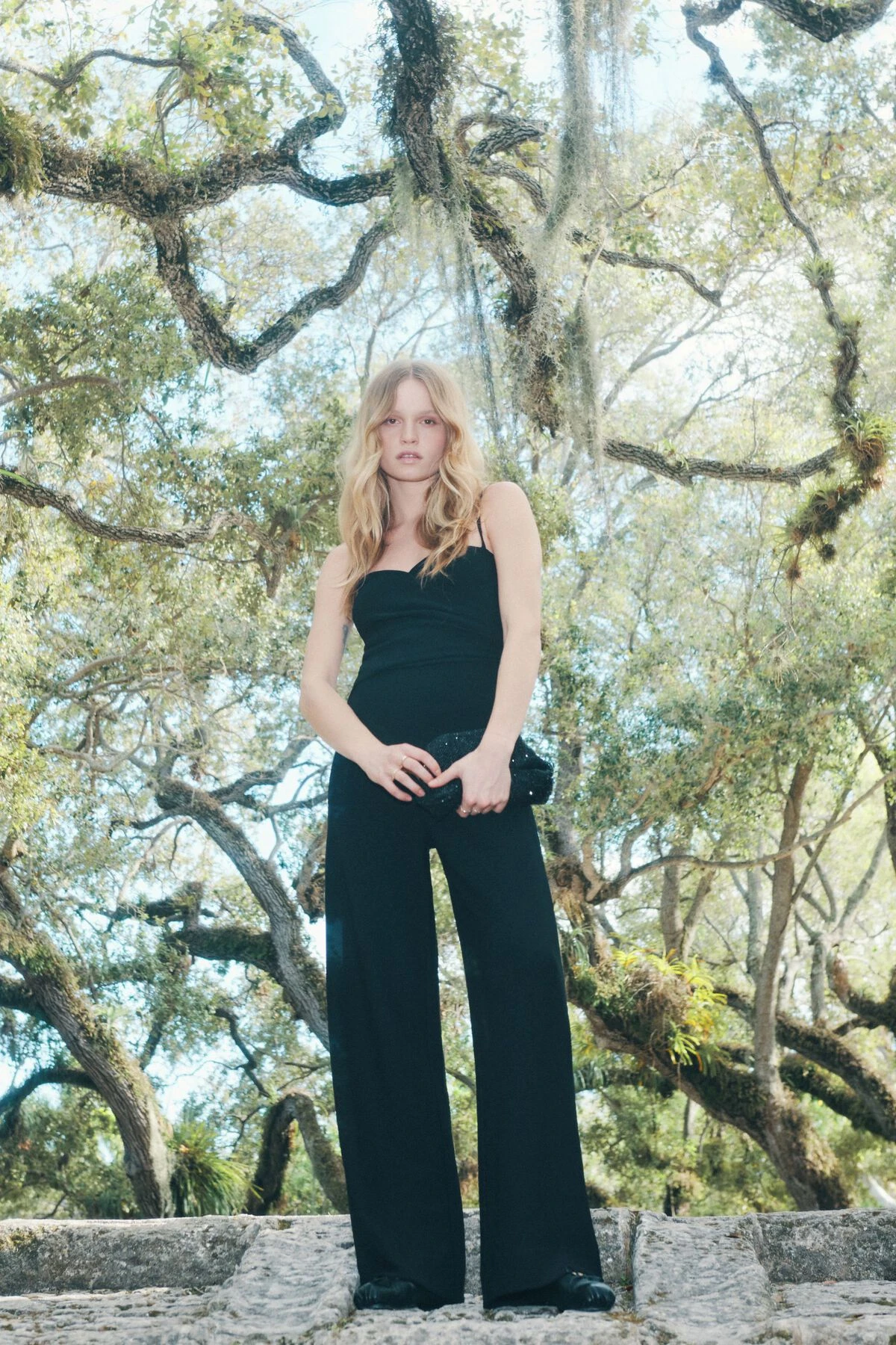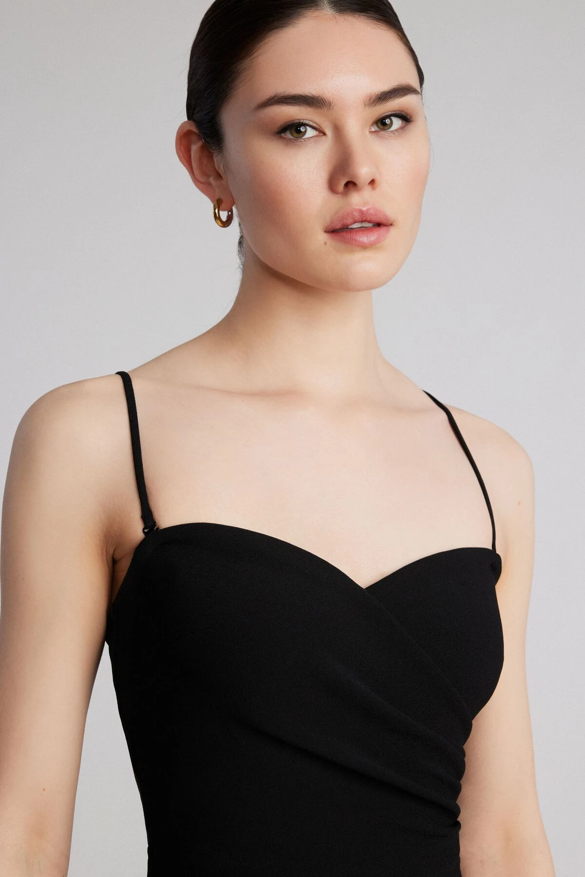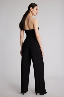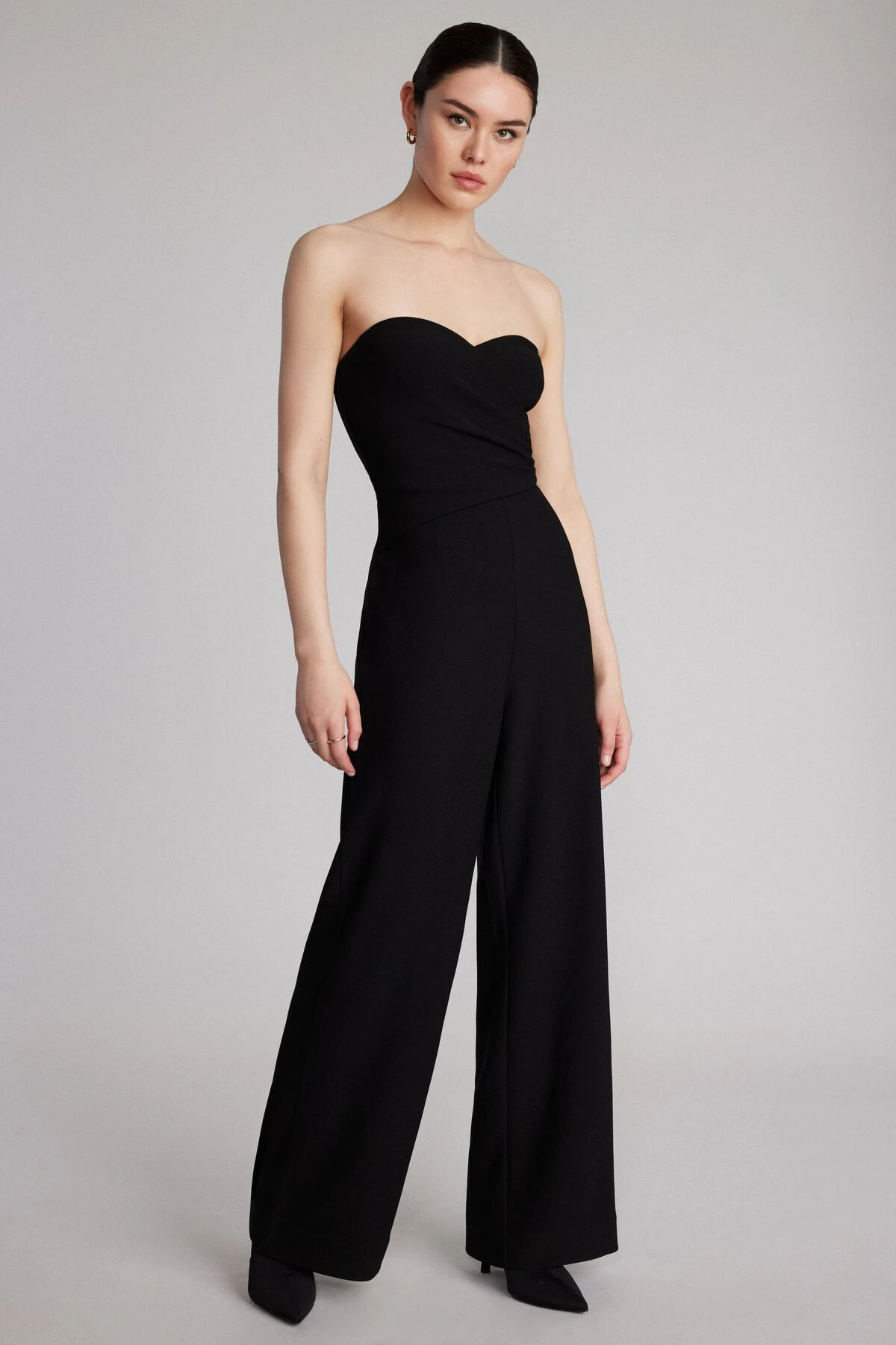 This is a tailored sweetheart neckline body contouring jumpsuit. It comes with removable straps if a strapless look is desired.