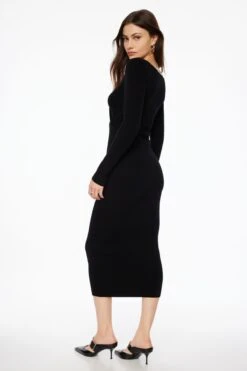 This is a twisted cutout rib knit dress – Designed to be fitted to your form.