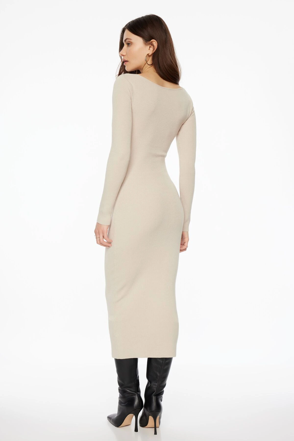 This is a twisted cutout rib knit dress – Designed to be fitted to your form.