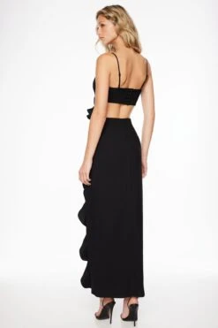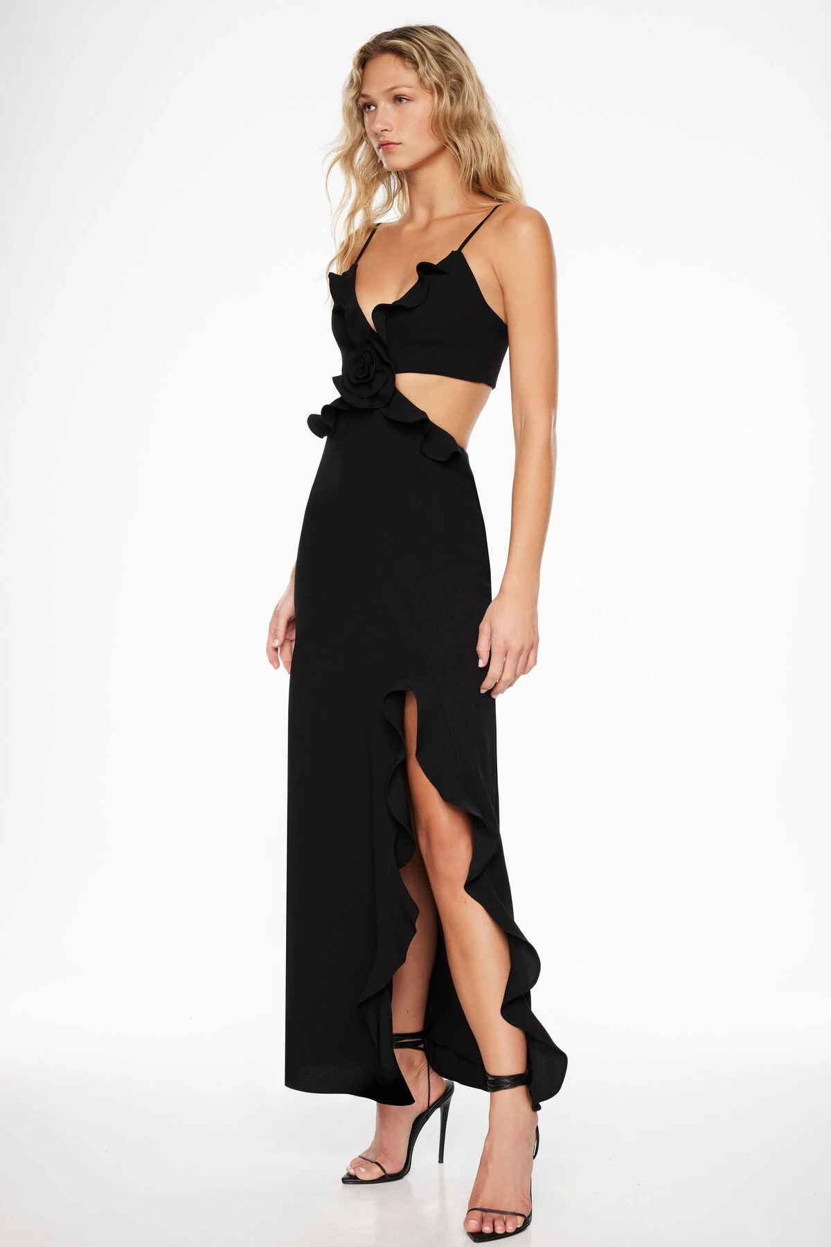 This is a ruffle detail maxi dress – Designed with a flower appliqué detail.