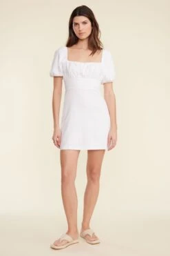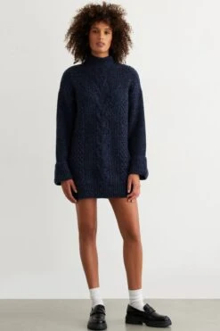This is a feminine sweater mini dress with a cinched waist and a flowy skirt.