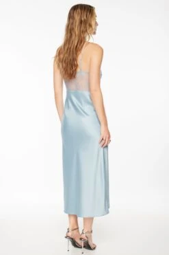 This is a satin slip midi dress with a lace trim – Designed with a lustrous fabric.
