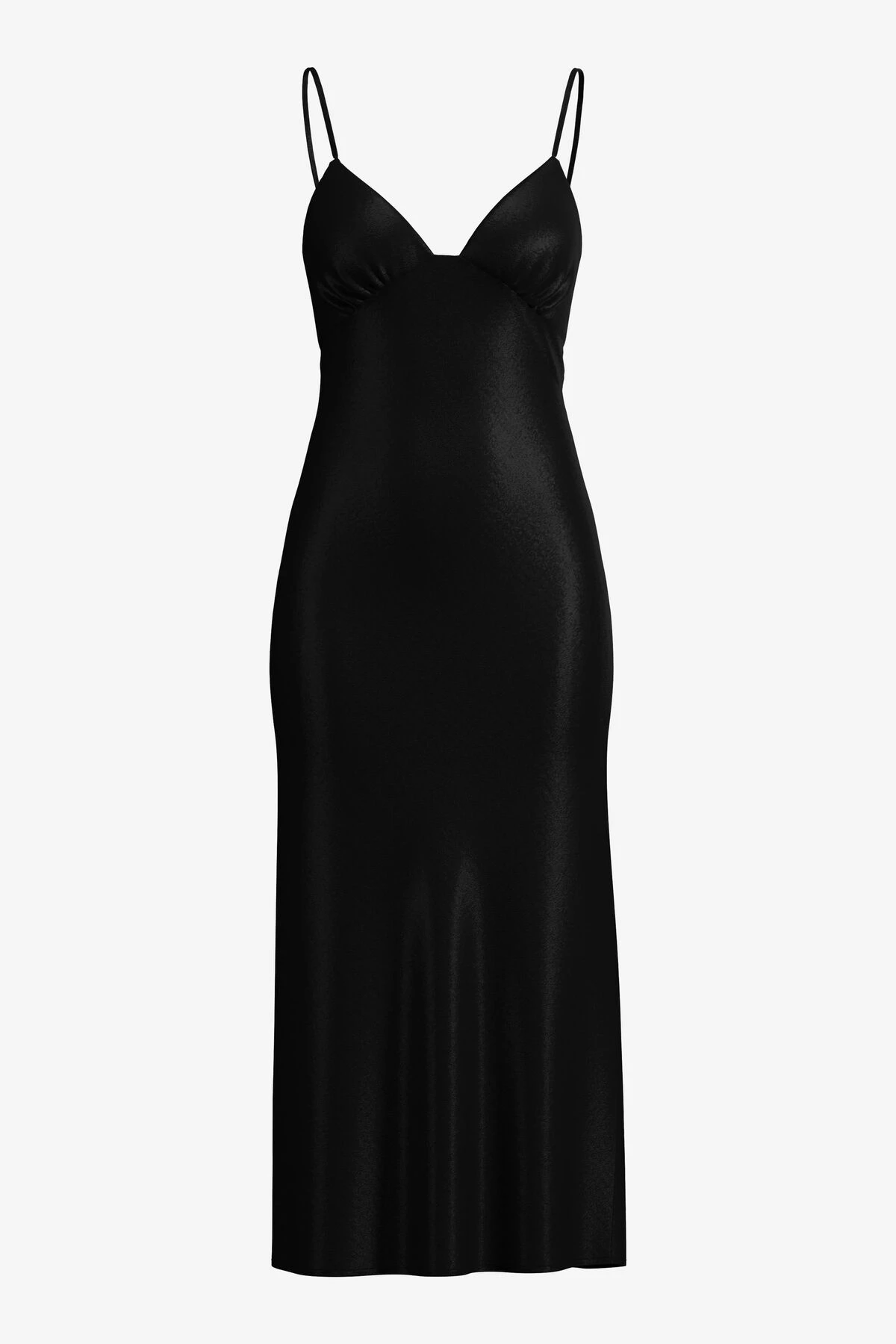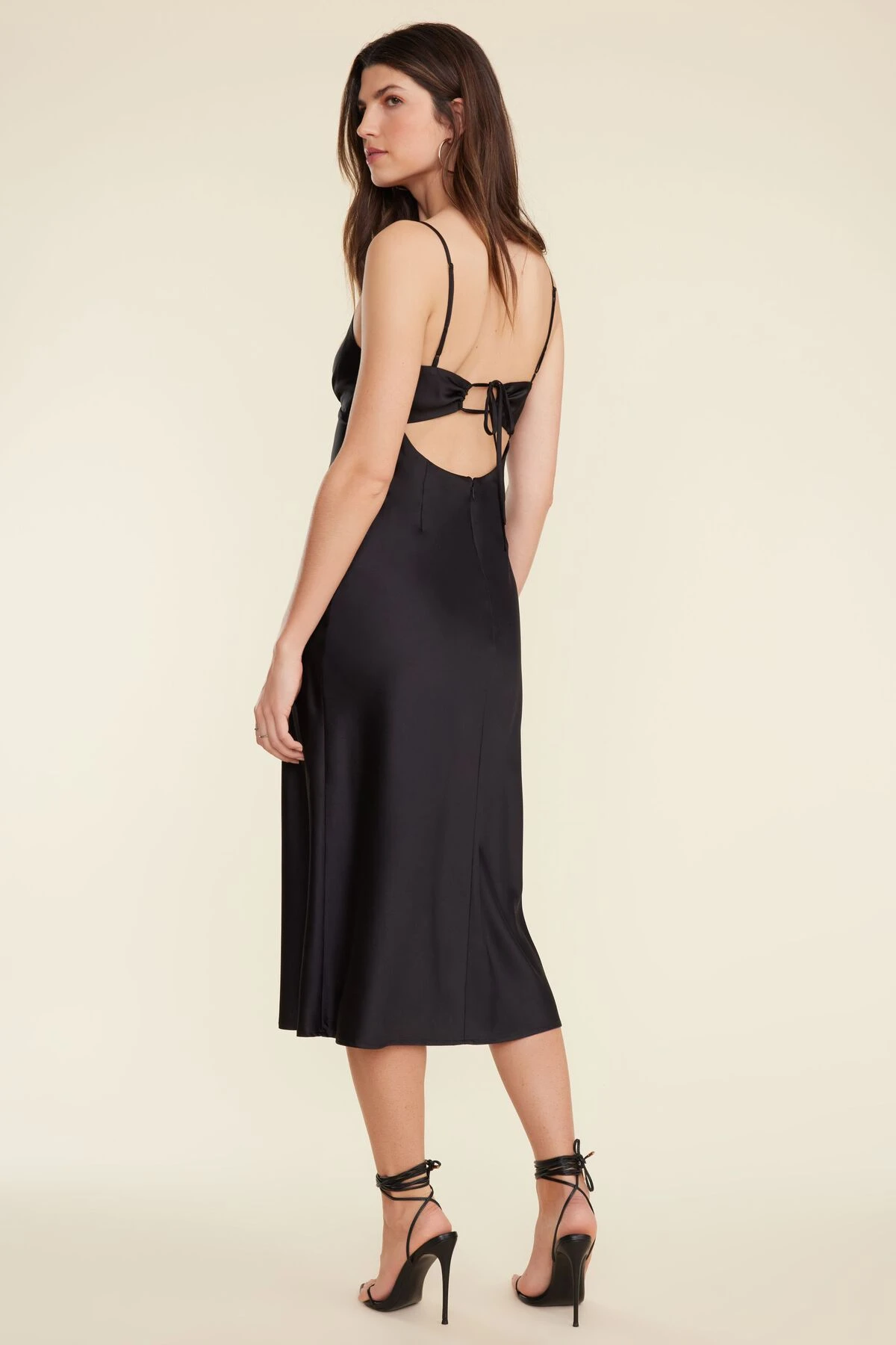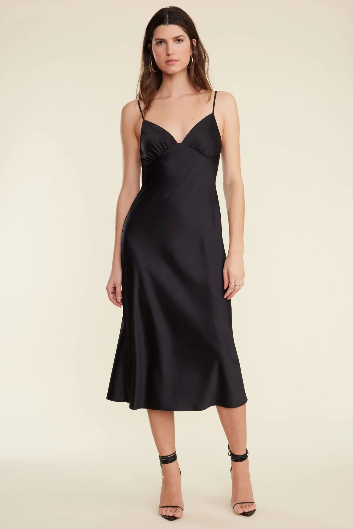 This is a slip on midi dress with a v-neckline and open back detail. Made with a soft and flattering satin fabric.